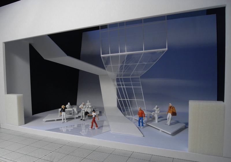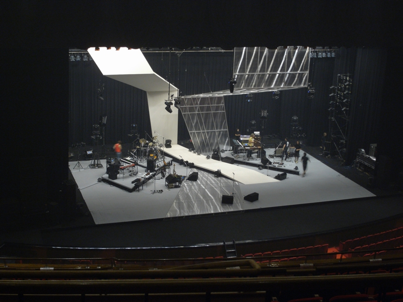 ステージ空間を埋め尽くすのではなく囲うことによってその広がりを最大限に感じられるものとしました。ステージ上で生まれるその奥行きは、客席全体の大きな空間と混ざり合い、見ている場所と演じられている場所との境目をなくします。舞台最前部から始まる透明の帯は、不透明の白い布帯と交わりながら上空へと伸び、両者の隙間からは、さらにその向こう側にあるもの(例えば空)が垣間見られることを考えました。